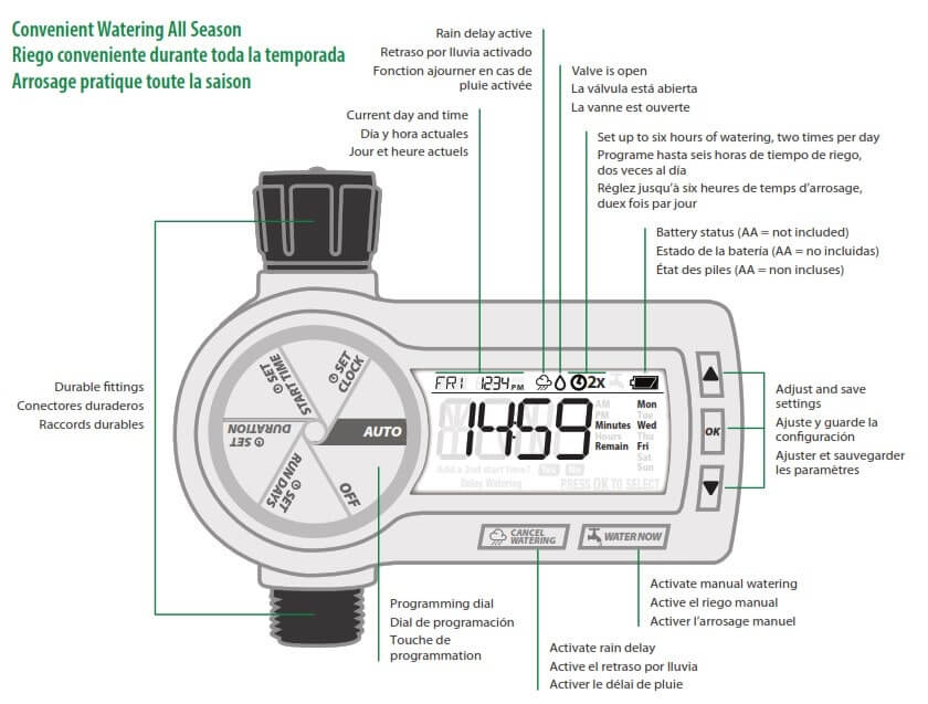 Temporizador digital de 7 días fácil de usar con funciones avanzadas Ideal para los aspersores de manguera y los kits de riego por goteo de Rain Bird Utilícelo para regar todo su jardín Temperatura de trabajo: evitar la congelación – 110 °F (máximo) Botones de anulación instantánea para el retraso del riego (Cancel Watering) y el riego manual (Water Now) Ideal para utilizar con los aspersores de manguera y los kits de riego por goteo de Rain Bird Los botones «Regar ahora» y «Cancelar» permiten anular los programas al instante cuando se desee Cuando está en funcionamiento, la pantalla muestra el estado del programa, así como el siguiente riego programado y el tiempo restante del riego actual. Diseñado para uso exterior con agua fría únicamente. Programe hasta dos riegos diarios, cualquier día de la semana Utiliza dos pilas AA (no incluidas) Características La configuración digital permite adaptar los programas para obtener mejores resultados con menor consumo de agua El riego programado hasta dos veces al día permite el riego terrenos en pendiente o suelo arcilloso La programación por día de la semana permite respetar las restricciones de agua Botones de anulación instantánea para el retraso del riego (Cancel Watering) y el riego manual (Water Now) También se puede establecer un retraso específico por lluvia de hasta 96 horas sin que afecte al programa almacenado Pantalla grande que permite ver toda la configuración de un vistazo. Resistente collarín de entrada para un rendimiento hermético Diseño de alto flujo con válvula de baja pérdida de presión Especificaciones 8,1″ alto x 8,5″ ancho x 3″ diámetro Número de programas 2 Número de zonas: 1 Diseñado para uso exterior con agua fría únicamente. Presión de agua en funcionamiento: 15 psi (mínimo) – 90 psi (máximo) Temperatura de funcionamiento: Proteja el temporizador contra la congelación – 110 °F (máxima) Utiliza dos pilas AA (no incluidas)