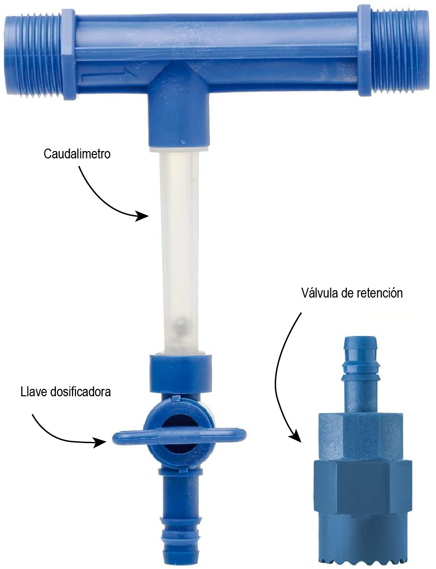 -Llave dosificadora: sirve para aumentar o disminuir la dosis de fertilizante que queremos insertar en la instalación. También sirve de válvula anti-retorno cuando cerramos.